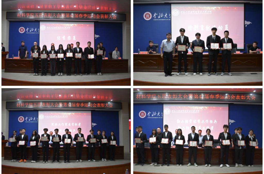 在瑾瑜国际会议中心隆重召开五四表彰大会暨第42届春季运动会表彰大会。院党委书记廖海洪、院长王强、科研副院长刘斌、教学副院长王超、青年教师代表闫钊鸣、院团委书记郝诗韵、复合材料与工程学生党支部书记李静出席表彰大会。