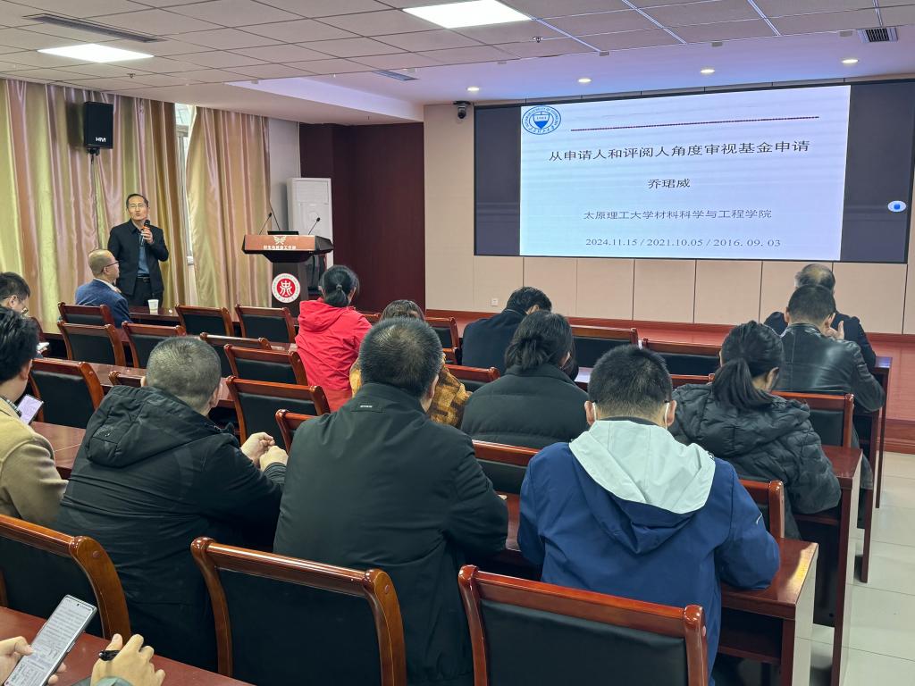 在11号楼7层报告厅召开了2025年国家自然科学基金申报启动及经验交流会,学院邀请了太原理工大学乔珺威教授作题为《从申请人和评阅人角度审视基金申请》的专题报告,院长王强出席并作申报动员,会议由科研副院长刘斌主持,学院全体45岁以下青年教师参会。