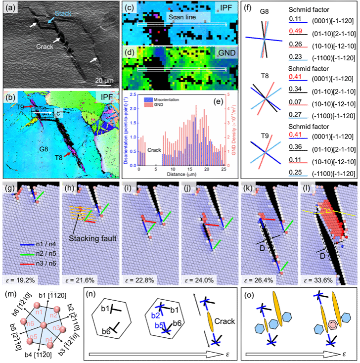 图. (a) 扫描电镜下的裂纹;(b, c) 晶界取向分布;(d) 1/2<11-20>几何必要位错分布;(e) 取向与位错的线扫;(f)滑移轨迹和Schmidt因子计算;(g-l) 裂纹形核与扩展过程的晶体相场模拟;(m) {000}上的位错与Burgers矢量关系示意图;(n) 位错增殖与传播路径示意图;(o) 裂纹扩展引起晶粒旋转示意图