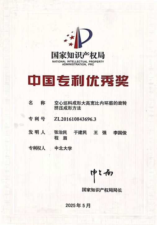 张治民教授领衔的精密塑性成形团队发明专利“空心坯料成形大高宽比内环筋的旋转挤压方法(张治民、于建民、王强、李国俊、程眉)”荣获中国专利优秀奖。这是该团队继获第二十四届中国专利优秀奖后又一次上榜,充分彰显了团队持续的自主创新能力。