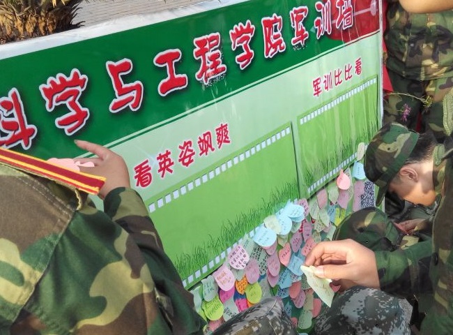 军训墙上,实时记录了同学们的心境及感受。军训墙上承载着新生们各种话语的小纸条不失为一道亮丽的风景线。