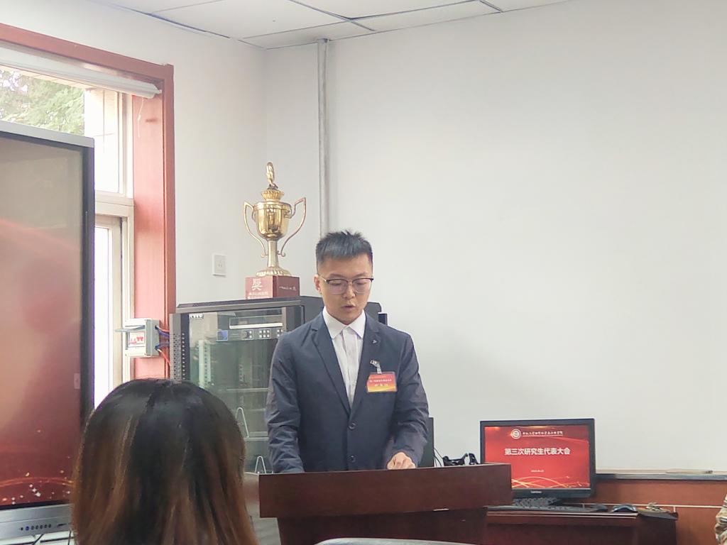 上届研究生会主席王君代表第二届研究生会做工作报告。本次报告全面总结了第二届研究生会工作取得的主要成绩,科学分析了学生工作的基本经验,明确提出了研究生会工作的职责和使命,并对新一届院研究生会工作寄予厚望。
