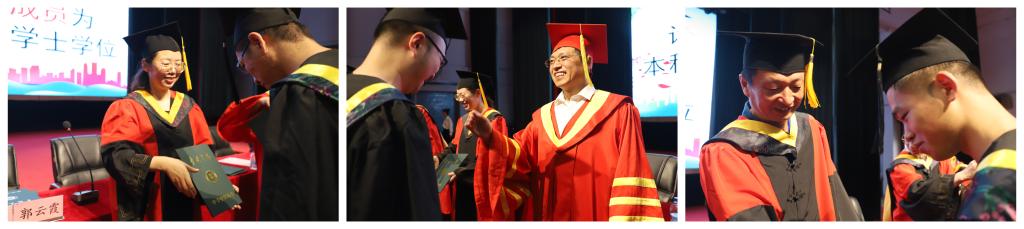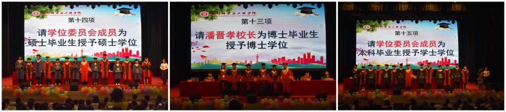 接下来的学位授予仪式,首先由教学副院长李迎春教授宣读《关于授予2019届毕业生学位的决定》。潘副校长亲自为5名博士逐一授学位,学位委员会成员为本届硕士和学士等616名毕业生逐一拨穗、授学位。全体毕业生带着无比激动和喜悦的心情,向老师鞠躬致谢,并与导师们合影留念。神圣的拨穗仪式,将毕业典礼推向高潮。