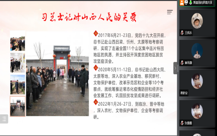 2022年3月3日下午4时,材料学教工党支部、研究生材料加工一支部与无机非金属材料工程学生党支部通过线下和线上结合的方式召开会议进行了理论学习——学习贯彻习近平总书记考察调研山西重要指示精神。联系党委委员、院党委副书记郭云霞同志主讲,三个党支部全体党员参加会议。