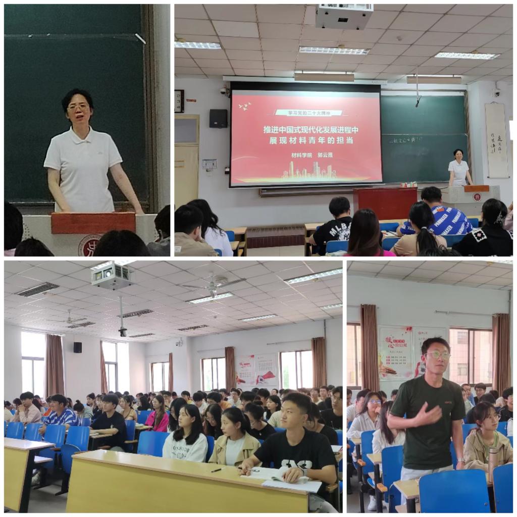 2023年5月30日下午,高分子材料与工程学生党支部在11212H教室进行了理论学习——《推进中国式现代化发展进程中展现材料青年的担当》,党委委员、学院党委副书记郭云霞同志主讲,高分子材料与工程学生党支部全体党员、积极分子参加学习。