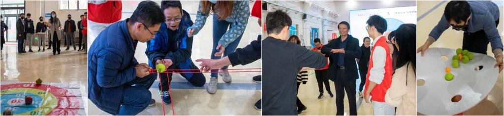 本次活动全院分成6个团队,通过集体项目充分发挥团队合作力。比赛过程中,老师们放下往日的优雅和严厉,热情参与,积极投入。集体项目中考验默契度的,当属“轨道传球”。哨声一响,每个团队中8位老师小心翼翼拽紧手中的细绳,合力将绳索上的网球运送到终点。最后的“超级传导”项目,老师们更是使出浑身解数进行演绎,赛场上充满了欢声笑语,形成一片欢乐和谐的氛围。裁判员们认真负责,公平公正。学生志愿者们也兴致勃勃,为老师们加油打气。