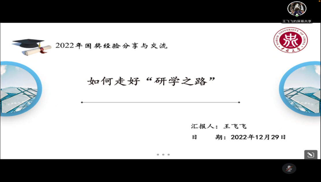 随后,王燕老师分别介绍了三位研究生代表的经历、荣誉和成果。接着分别由景心怡、王飞飞、徐登基三位同学从自身经历出发,围绕学习经验、善用学术工具、撰写论文等进行了丰富和精彩的交流与分享。