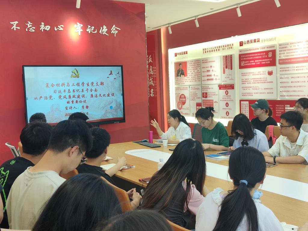 2023年06月16日上午,复合材料与工程学生党支部于图书馆四楼青年廉洁文化研究中心开展了“习近平总书记关于全面从严治党、党风廉政建设、廉洁文化建设的重要论述”的专题党课,支部书记李静同志主讲,支部党员、发展对象和积极分子参加了党课学习。